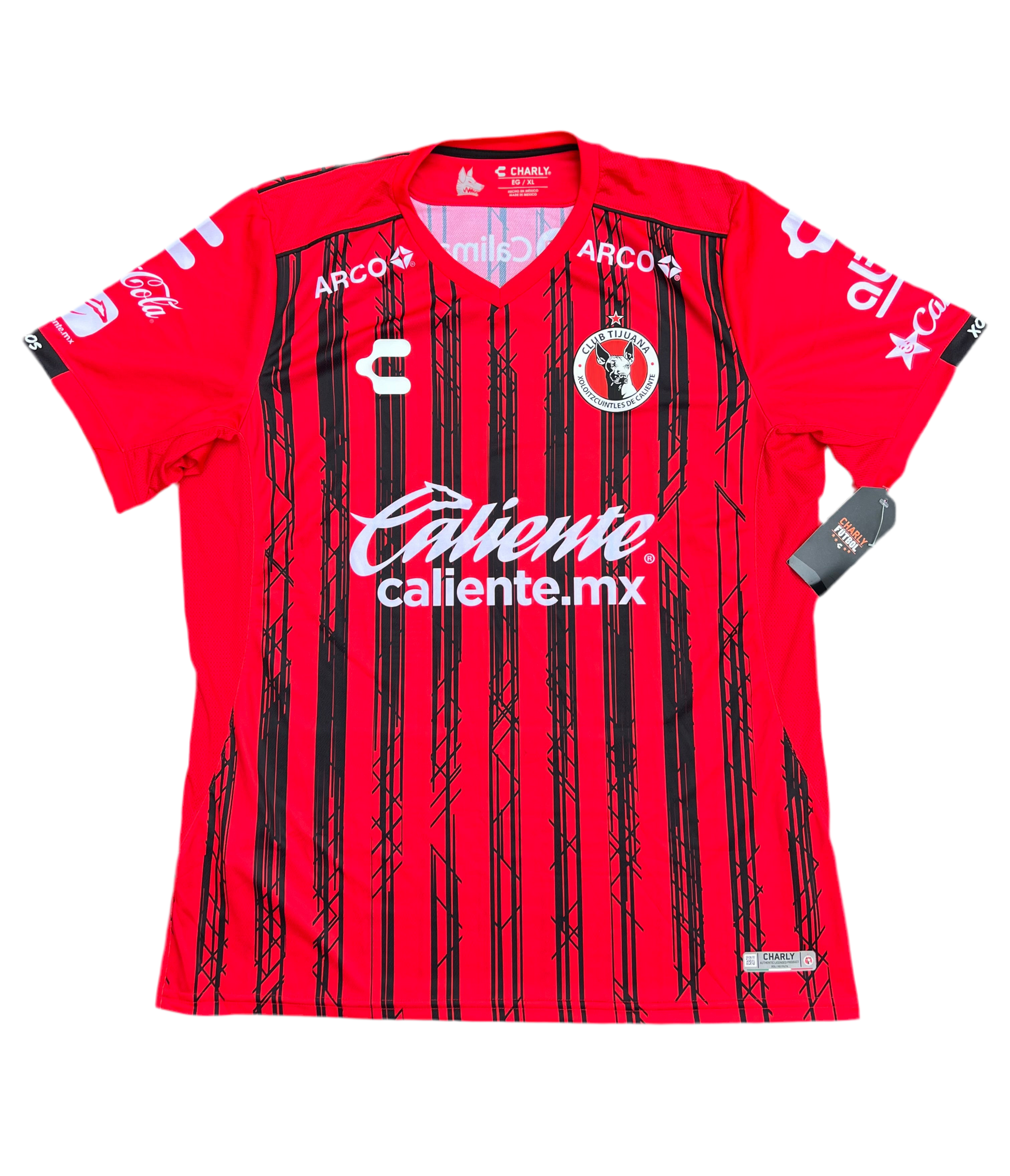 Gorący klimat meksykańskiej piłki w najczystszej postaci. Koszulka domowa Club Tijuana Xoloitzcuintles de Caliente z sezonu 2019/20 od marki Charly to połączenie pasji, energii i charakteru drużyny z północy Meksyku. Intensywna czerwień symbolizuje temperament „Xolos”, a dynamiczne, nieregularne czarne wzory na froncie podkreślają nowoczesny styl i nieustępliwość zespołu.